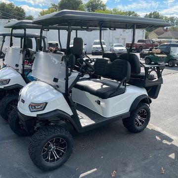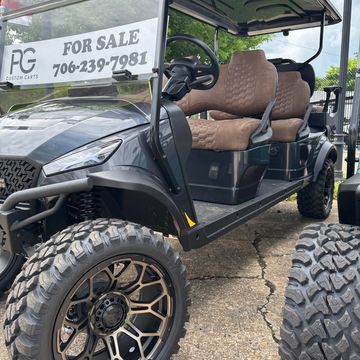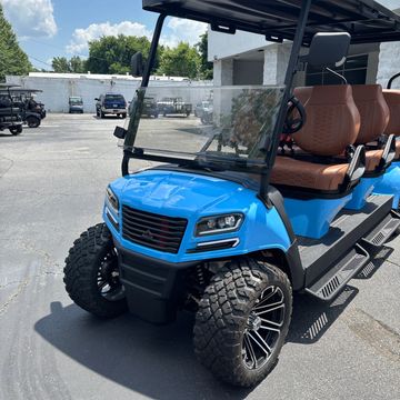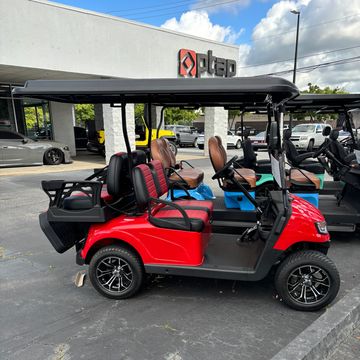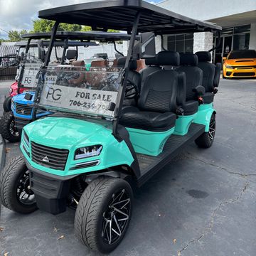 Forward facing 6 passenger cart that comes fully loaded with Carplay radio, wireless phone charger and color changing headlights powered by 52V lithium battery that is covered with an 8-year warranty